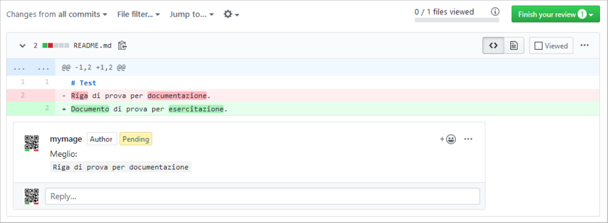 Proseguire con eventuali revisioni in altre parti di codice. Inseriti tutti i commenti fare clic su Finish your review N, dove N è il numero di revisioni effettuate. Procedere quindi con l”Invio della revisione.